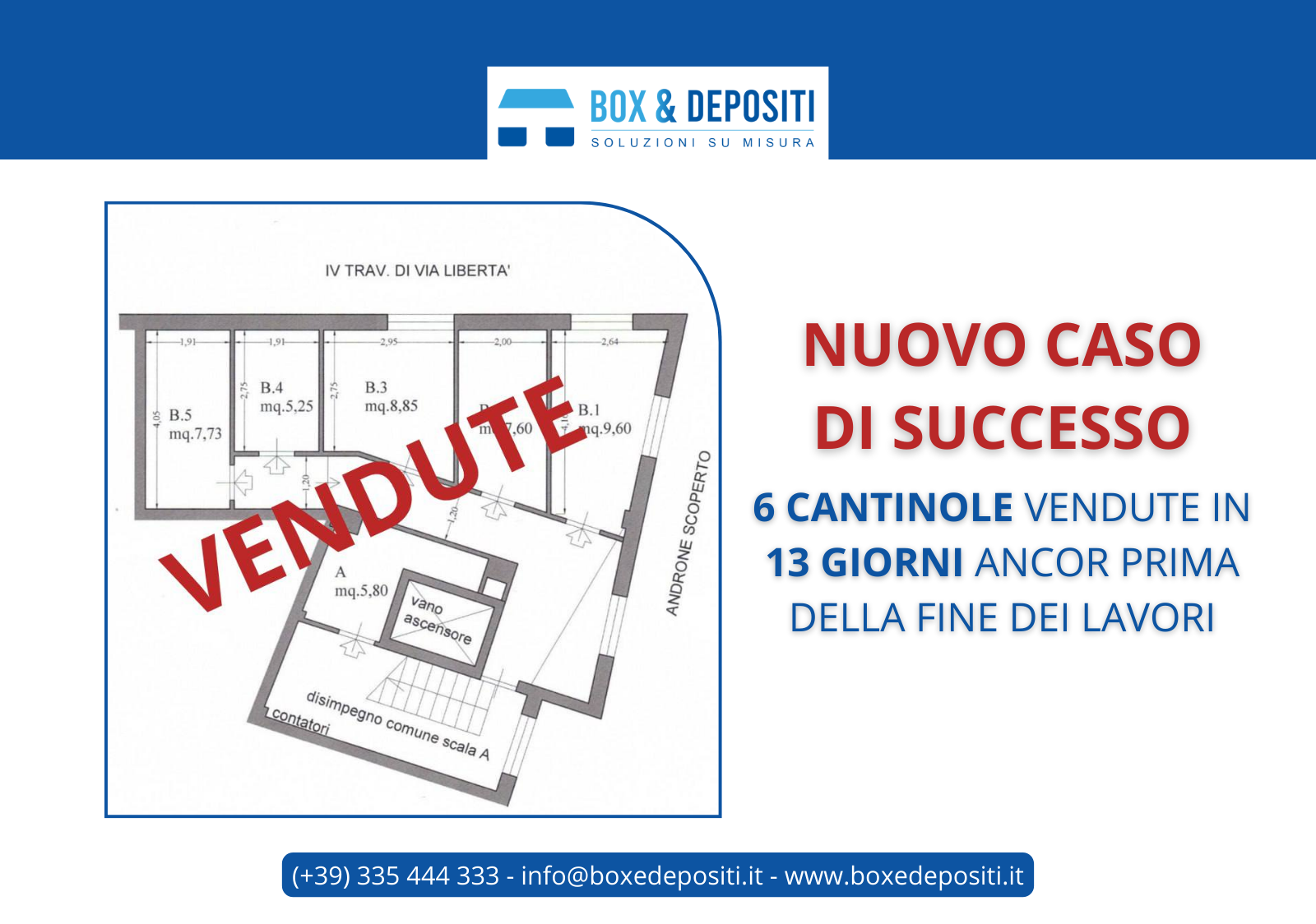 Il settore dei box, dei depositi e delle cantinole sta vivendo un vero e proprio boom e i numeri parlano chiaro! Ancora prima del completamento dei lavori, Box & Depositi è riuscito a vendere 6 cantinole in soli 13 giorni. Questo incredibile risultato conferma l’elevata richiesta di soluzioni di box, depositi e cantinole, dimostrando come […]