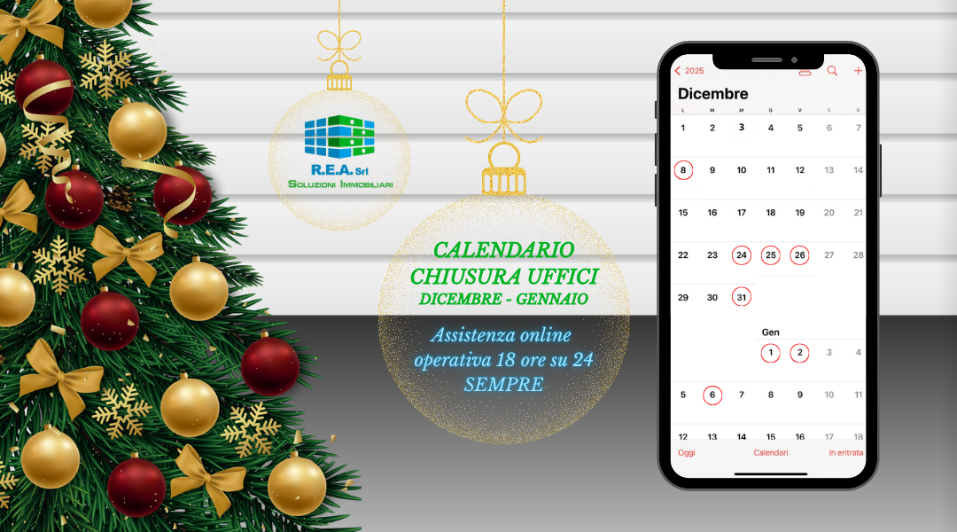 Ti informiamo che gli uffici della R. E. A. srl resteranno chiusi nelle seguenti date: 08/12 24/12 25/12 26/12 31/12 01/01 02/01 06/01 La chiusura riguarda esclusivamente gli uffici: tutte le attività fondamentali legate ai nostri immobili e ai tuoi investimenti continueranno senza alcuna interruzione: Gestione degli immobili Servizio online operativo 24/7 Assistenza clienti attiva […]